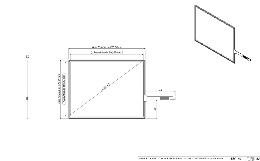 Dimensões: Área externa de: 225,50 x 173,50 (mm) / Área ativa de: 214,50 x 160,30 (mm) Comprimento do Cabo Flat: 88 mm Espessura da Tela: 2,3 mm