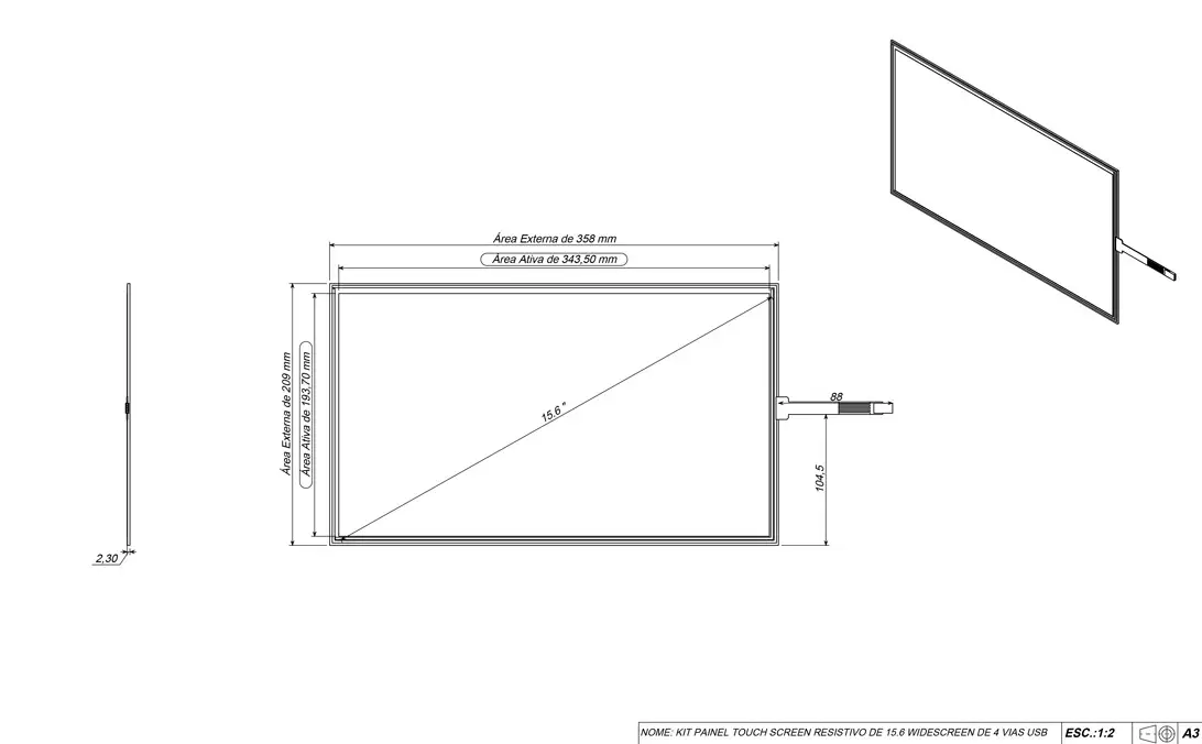Dimensões: Área externa de: 358 x 209 (mm) / Área ativa de: 343,50 x 193,70 (mm)