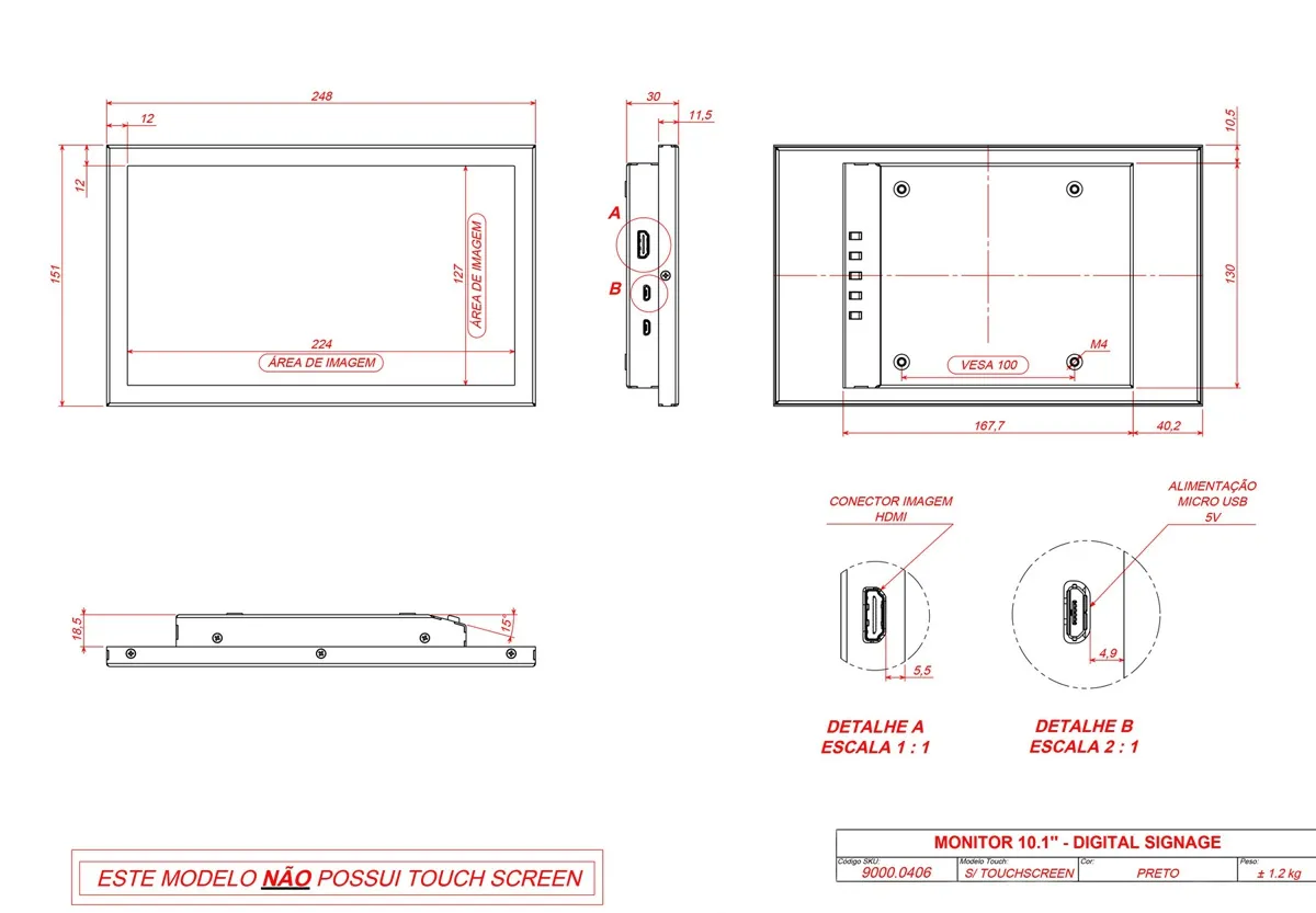 O monitor possui área visível de 10.1” no formato 16:9, com conexão HDMI. Resolução de 1024 x 600 pixels na tecnologia TFT-LCD e IPS. Som integrado através de mini Alto-falantes. Sua alimentação é através de cabo Micro-USB externo 5V.
