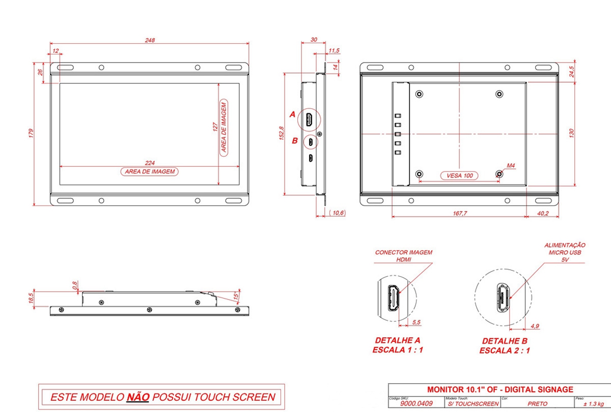 | Conteúdo da embalagem | Cabo HDMI, Cabo Micro USB para alimentação, Monitor open frame (sem touch screen) |