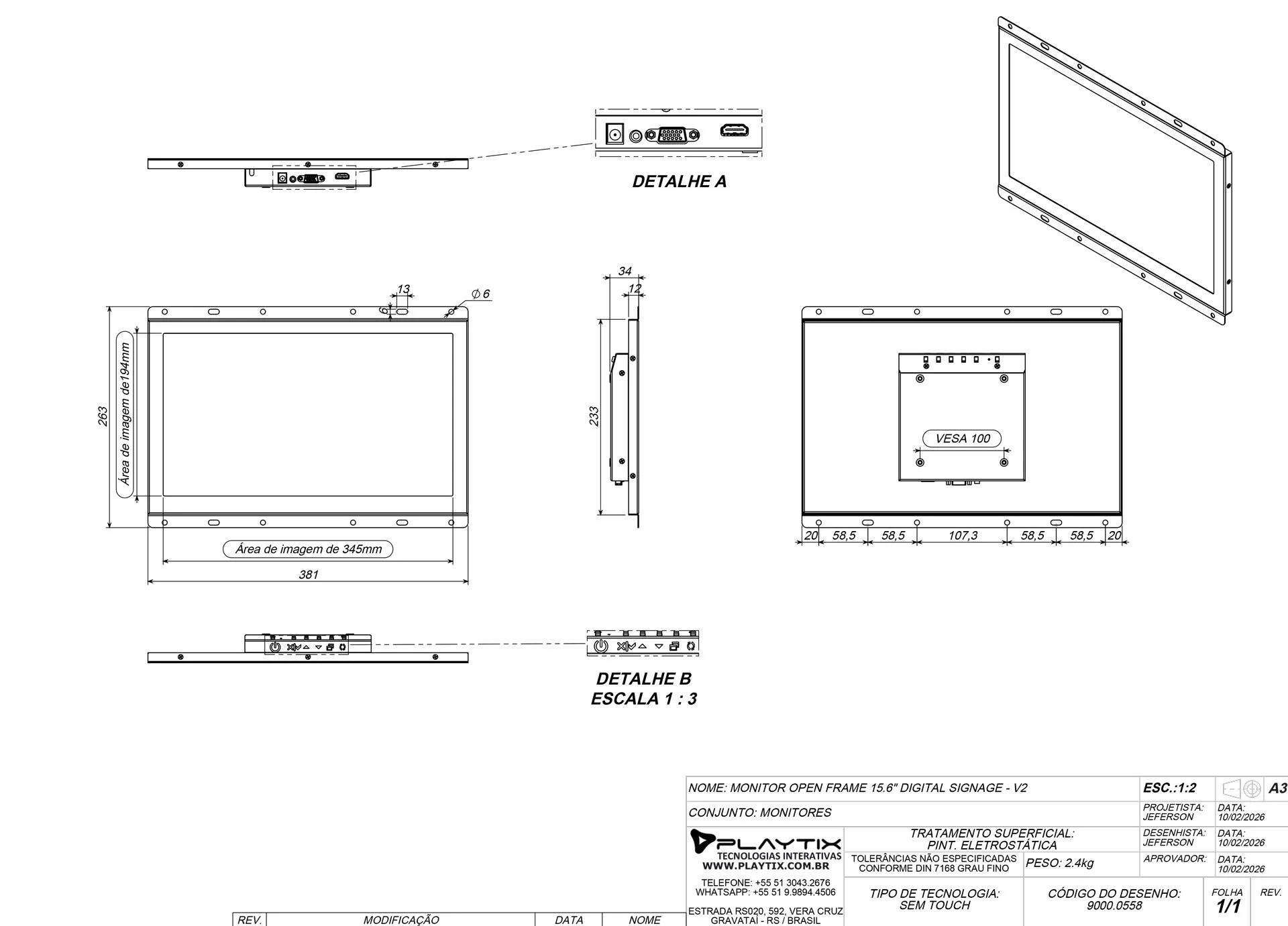O Monitor Open Frame de 15.6” foi projetado com objetivo de proporcionar rapidez, agilidade, qualidade e segurança durante sua instalação. Possui abas frontais que incluem oblongos e furações pré dispostos para instalação ágil e segura (ou pela furação VESA em sua parte traseira). Suas principais aplicações são automações Industriais, Comerciais e residenciais, por exemplo, sendo componente para a fabricação de totens, ATM, foto cabines, painéis de consulta, terminal de retirada de senhas entre outros. Devida sua robustez é uma excelente escolha para aplicações em ambientes insalubres, tais como cozinhas e áreas de produção industrial.