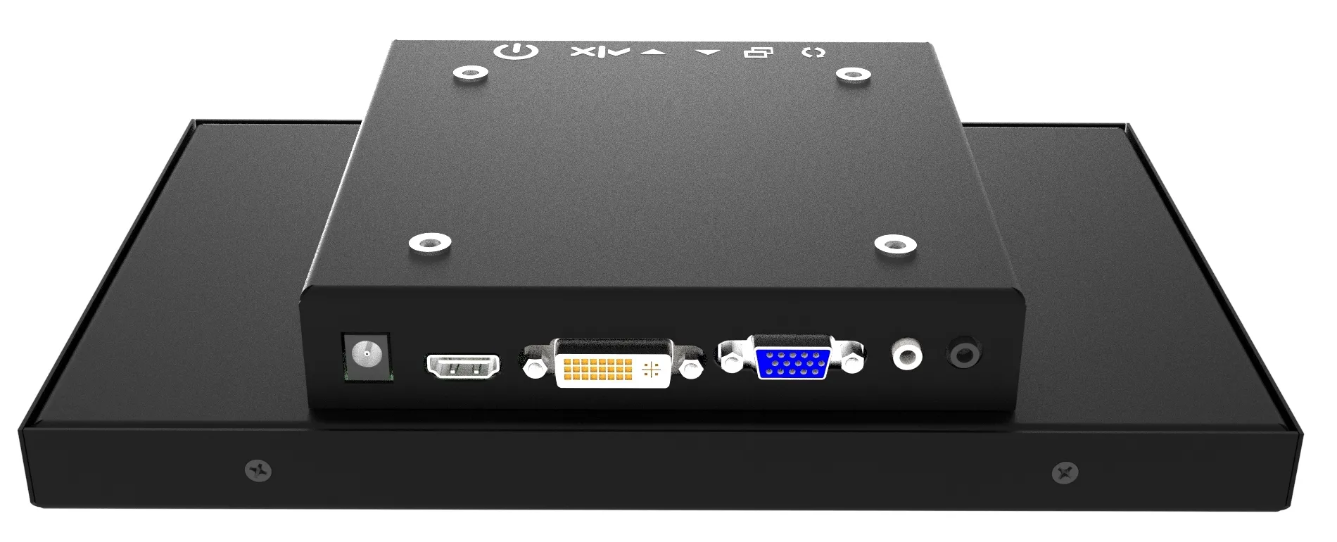 O monitor possui área visível e táctil de 10.1” no formato 16:9, com conexão VGA, DVI e HDMI.