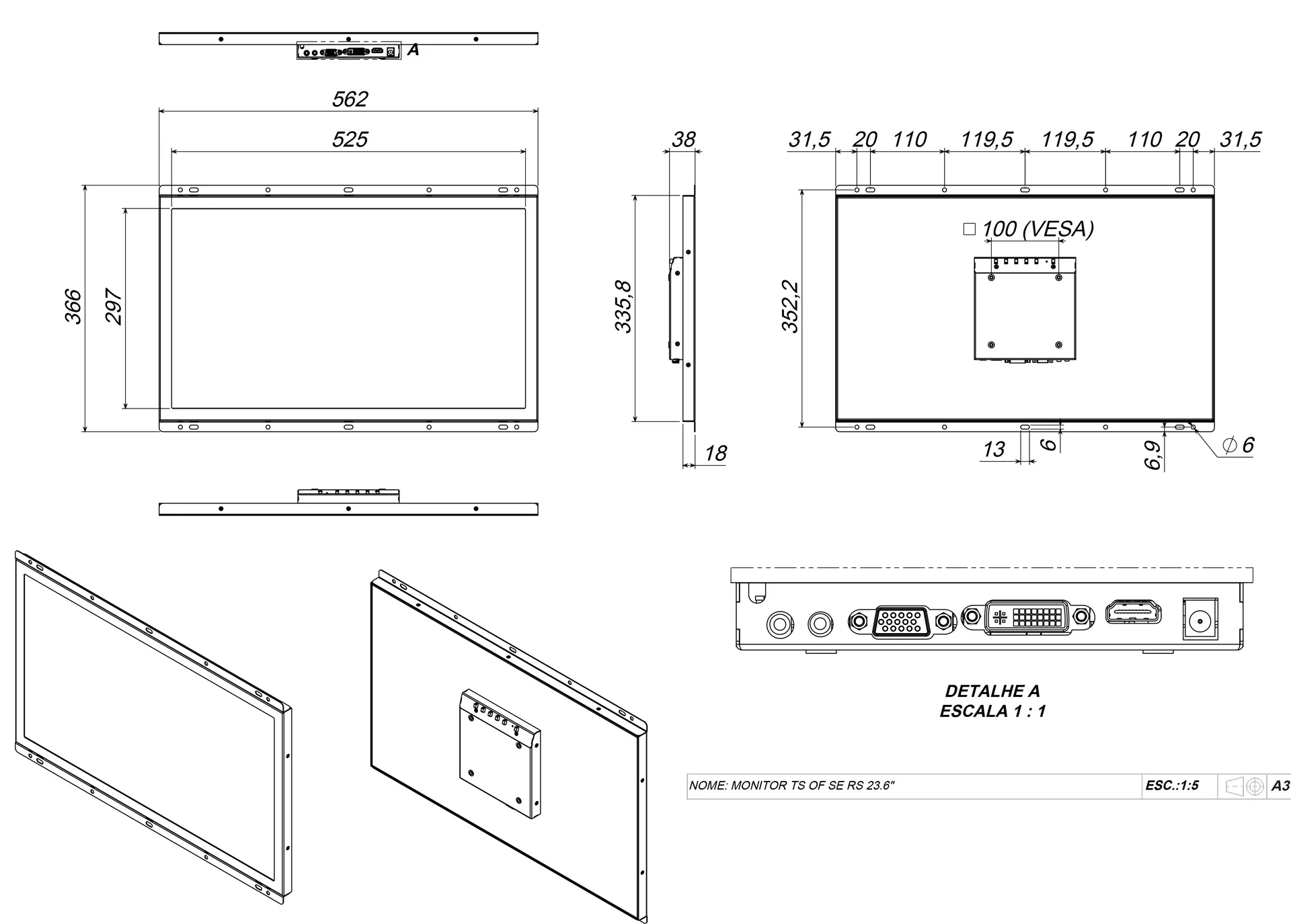 O Monitor Touch Screen Open Frame Resistivo Full HD de 23.6” USB foi projetado com objetivo de proporcionar rapidez, agilidade, qualidade e segurança durante sua instalação. Possui abas frontais que incluem oblongos e furações pré dispostos para instalação ágil e segura (ou pela furação VESA em sua parte traseira). Suas principais aplicações são automações Industriais, Comerciais e residenciais, por exemplo, sendo componente para a fabricação de totens, ATM, foto cabines, painéis de consulta, terminal de retirada de senhas entre outros. Devida sua robustez é uma excelente escolha para aplicações em ambientes insalubres, tais como cozinhas e áreas de produção industrial.