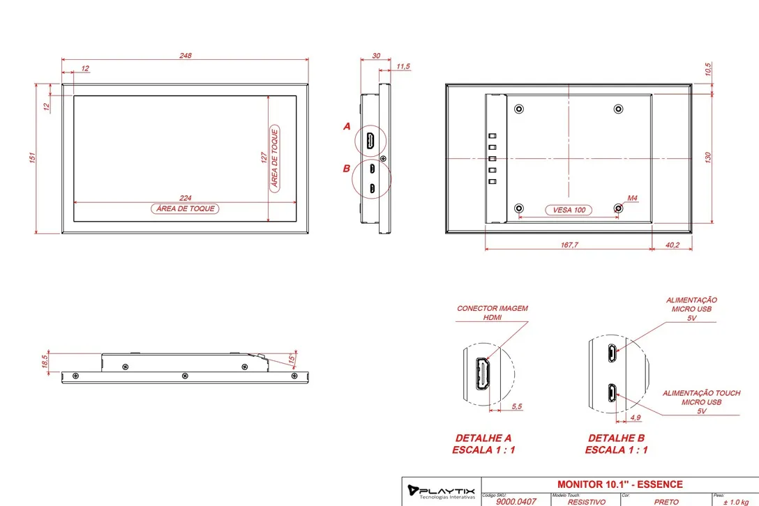 Monitor touch screen compacto de 10.1″ desenvolvido na tecnologia resistiva, fabricado em Aço com acabamento em pintura eletrostática na cor preta acetinada. Possui furação padrão VESA para ser adaptado em suportes disponíveis no mercado, assim como em suportes de paredes. Ideal para automação industrial, comercial e residencial devido sua robustez. Com um sistema de abas removíveis, permite fácil customização conforme a necessidade do usuário. Acompanha cabo HDMI e dois cabos Micro USB para alimentação e conexão do touch.