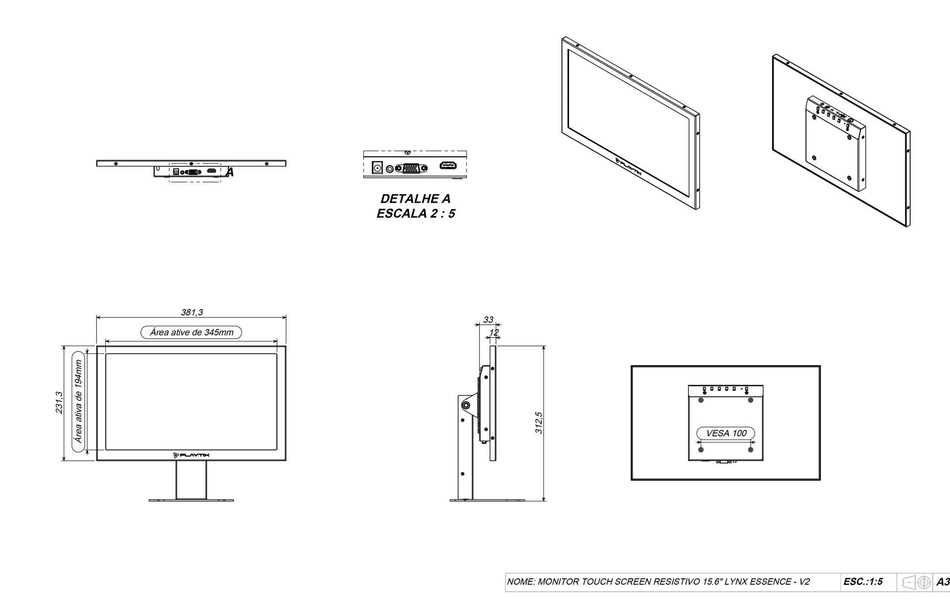 Monitor touch screen compacto de 15.6″ com suporte de mesa, desenvolvido na tecnologia resistiva, fabricado em Aço com acabamento em pintura eletrostática na cor preta acetinada. Possui furação padrão VESA que permite a adaptação em suportes disponíveis no mercado, assim como os de paredes. Ideal para automação industrial, comercial e residencial devido sua robustez. Acompanha cabo HDMI e Fonte externa bi-volt.