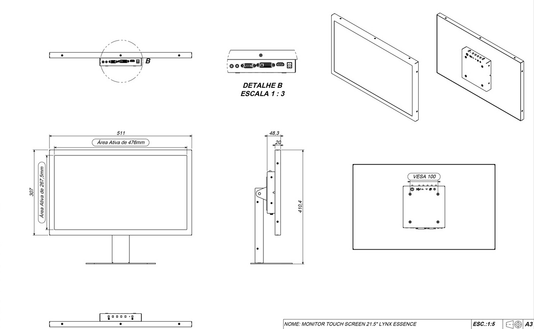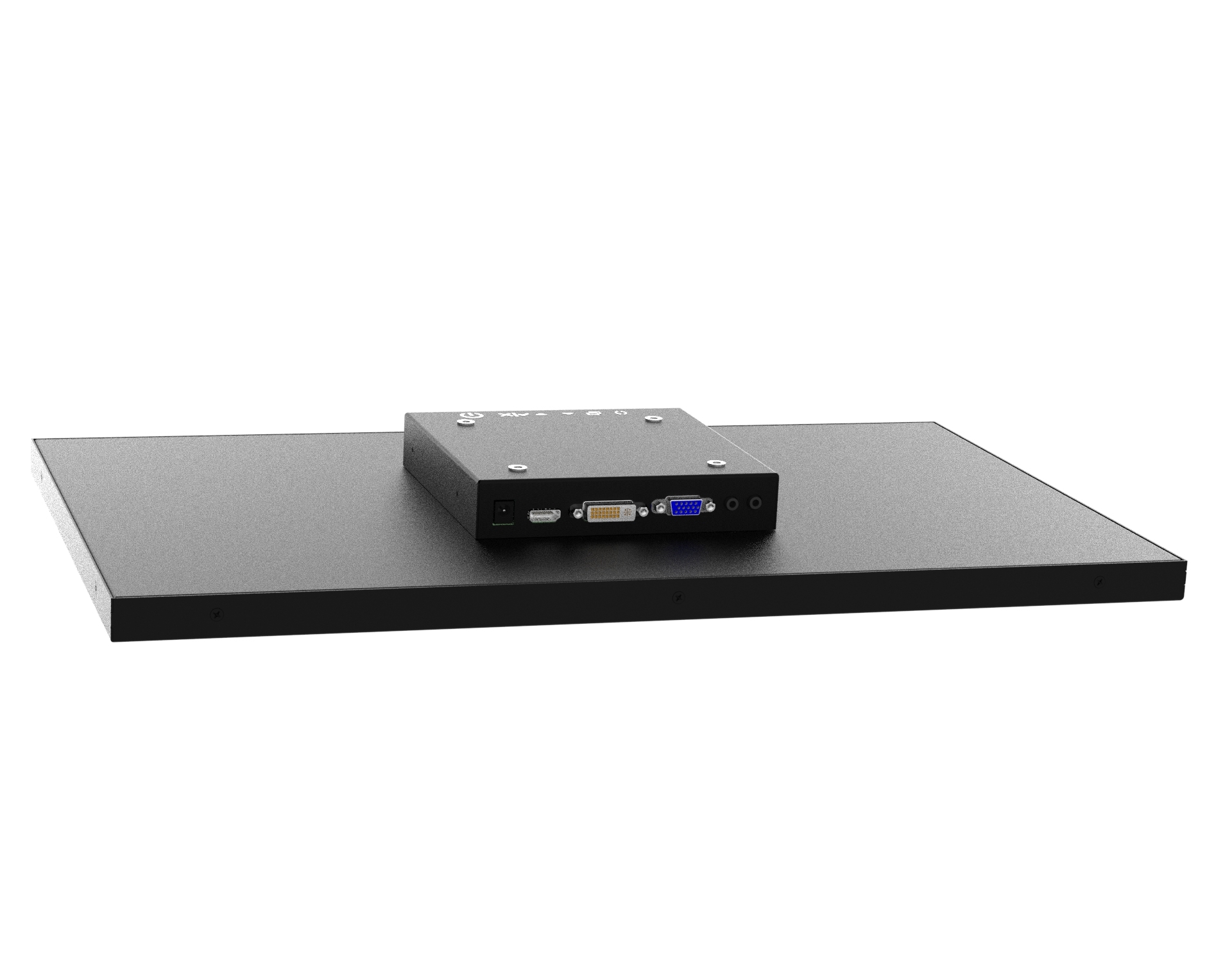 O monitor possui área visível e táctil de 21.5” no formato 16:9, com conexão VGA, DVI e HDMI. Resolução Full HD 1920 x 1080 pixels na tecnologia TFT-LCD. Sua alimentação é através de fonte externa bivolt. Equipado com touch resistivo de 21.5” conectado via USB.