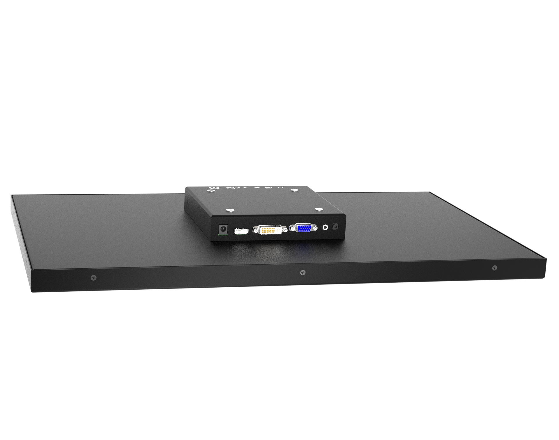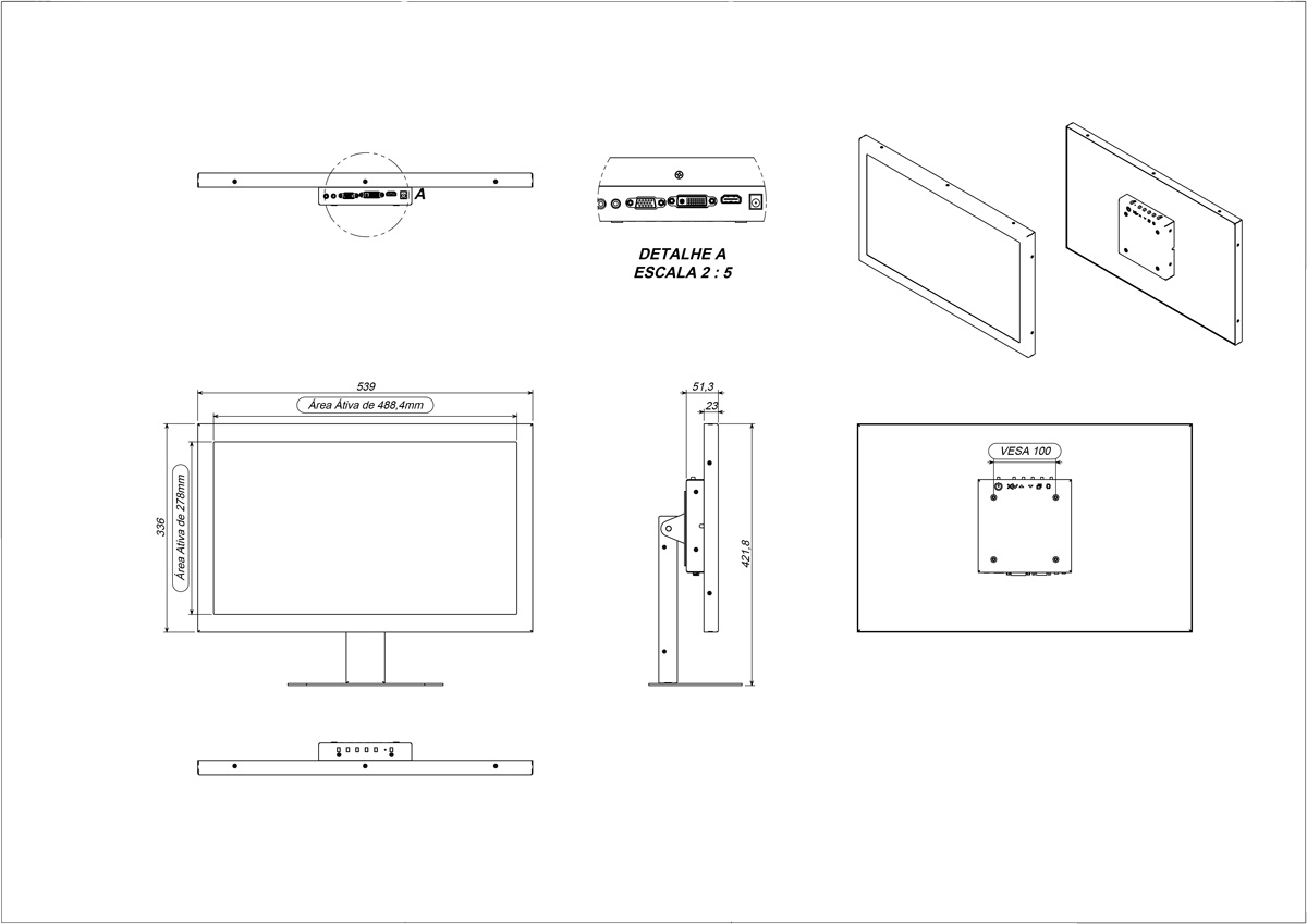 O monitor possui área visível e táctil de 21.5” no formato 16:9, com conexão VGA, DVI e HDMI. Resolução Full HD 1920 x 1080 pixels na tecnologia TFT-LCD. Sua alimentação é através de fonte externa bivolt. Equipado com touch capacitivo de 21.5” conectado via USB.
